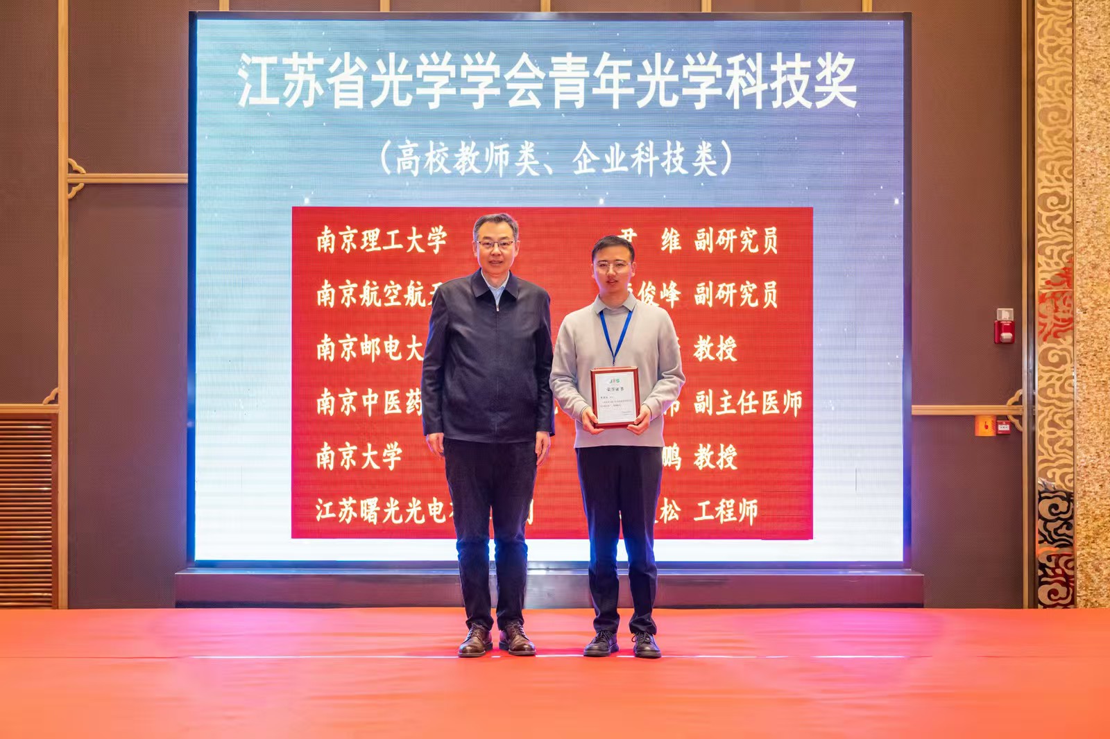 随后,会上进行了江苏省光学学会第十届青年光学科技奖颁奖仪式。名誉理事长崔一平教授、江苏省科协王小锋二级巡视员、理事长王振林教授分别为获奖人员颁发了证书和奖牌。